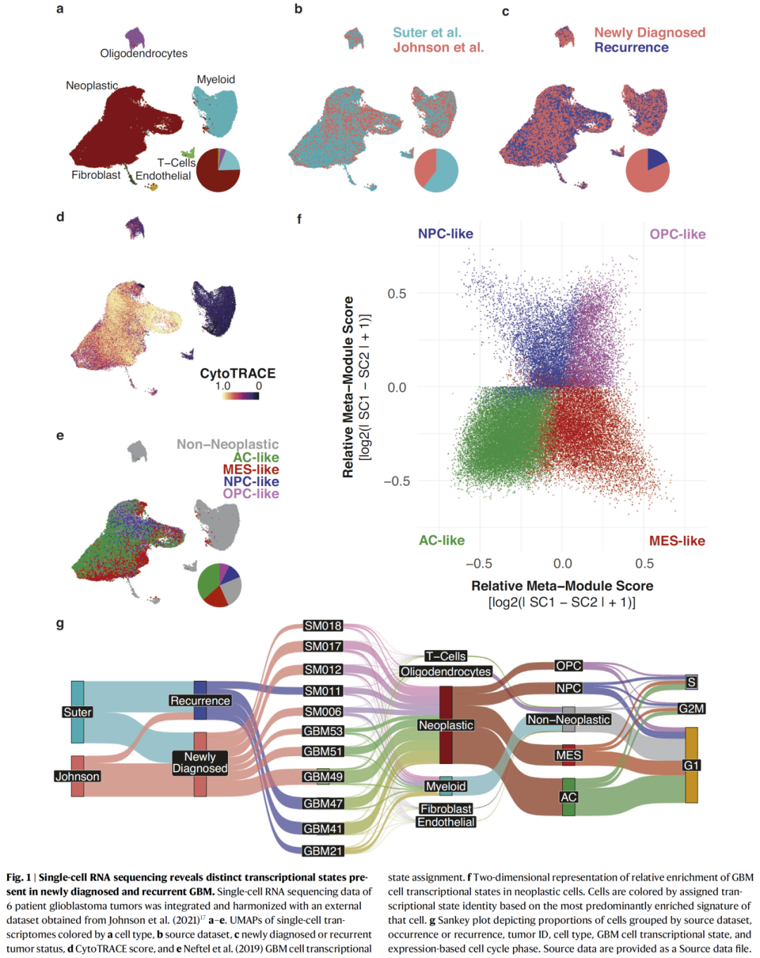 图1|单细胞RNA测序揭示新发与复发胶质母细胞瘤中的不同转录状态。