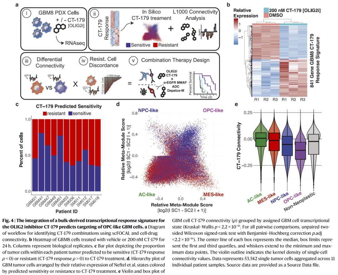 研究人员开发了 scFOCAL,通过整合单细胞RNA测序数据与LINCS L1000药物转录响应特征,量化不同肿瘤细胞状态的药物敏感性与耐药性景观。该框架能够识别选择性作用于特定胶质母细胞瘤细胞状态的化合物,并预测潜在的协同用药组合。研究人员在体外、离体和体内模型中验证了该方法的预测能力,并发现 OLIG2 抑制剂 CT-179 与抗 EGFR 抗体偶联药物 Depatux-M 的联合用药在小鼠模型中显著延长生存期。结果表明,scFOCAL 可作为一种通用策略,用于在单细胞尺度上识别对靶向治疗敏感或耐药的肿瘤细胞状态,并指导联合治疗方案设计。