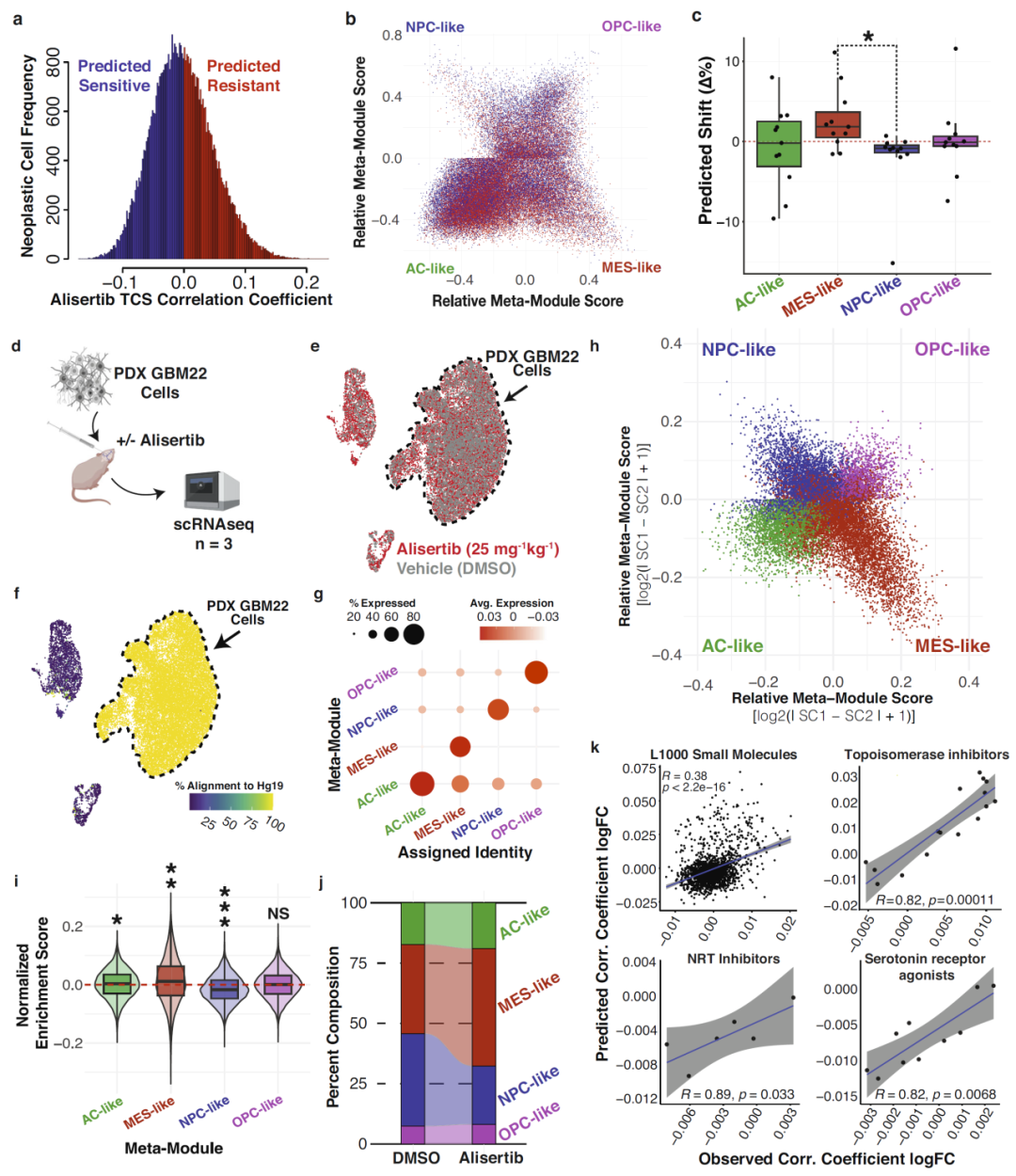 以 Aurora 激酶抑制剂 alisertib 为例,scFOCAL 预测神经前体样细胞对该药物更为敏感,而间充质样细胞更可能耐药。研究人员在小鼠原位移植模型中验证了这一预测,观察到治疗后肿瘤细胞群体组成向耐药状态转移。