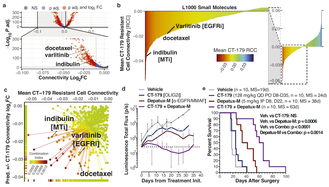 在此基础上,研究人员构建了用于联合用药筛选的组合评分策略,优先选择能够覆盖耐药细胞群体的药物。该方法成功预测并验证了 CT-179 与 Depatux-M 的协同效应,该组合在胶质母细胞瘤小鼠模型中显著抑制肿瘤生长并延长生存期。