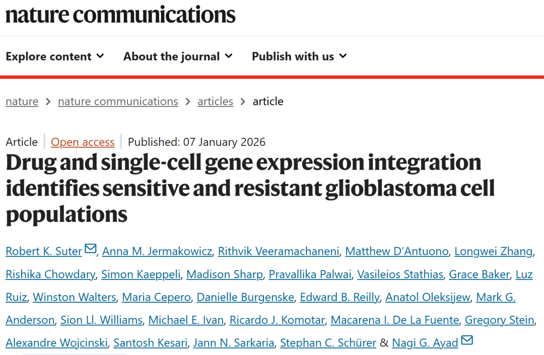 Suter, R.K., Jermakowicz, A.M., Veeramachaneni, R. et al. Drug and single-cell gene expression integration identifies sensitive and resistant glioblastoma cell populations. Nat Commun 17, 99 (2026).