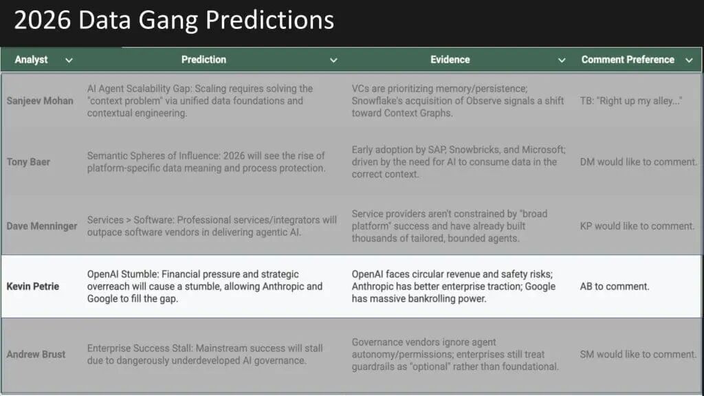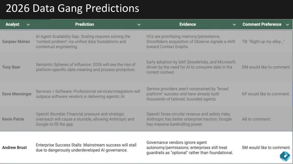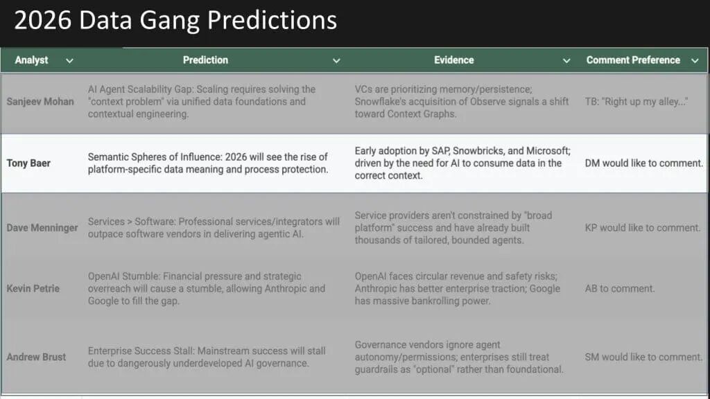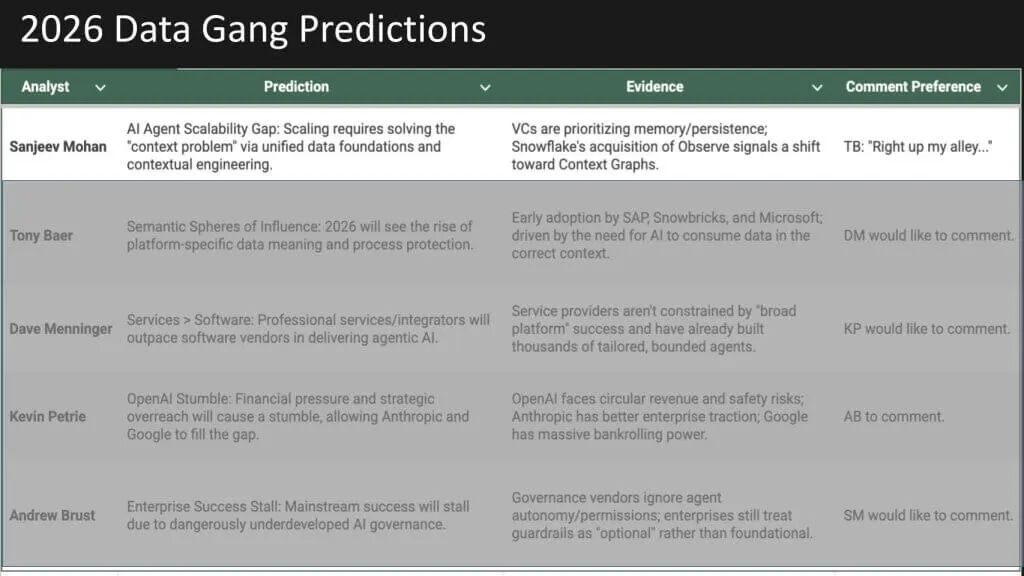 随着2025年回顾的完成,我们现在将讨论转向节目的核心——2026年预测。格式是指定分析师提出每个预测,然后由一两个其他分析师评论。如下所示,2026年预测都与数据相关或至少相邻,涵盖上下文、语义层和服务软件,同时对OpenAI和治理作为阻碍持怀疑态度。有了这个设置,让我们深入探讨。