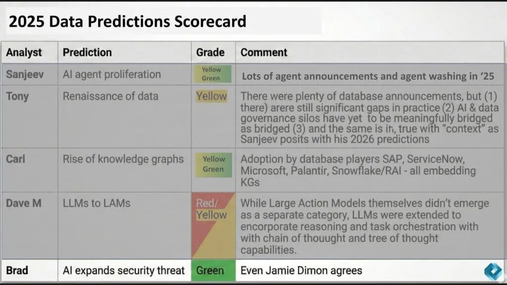 Tony Baer重新审视了他2025年的预测,即行业将看到数据复兴,基于一个简单的前提:如果人工智能聚光灯,那么好的数据就成为燃料,供应商和客户都将被迫相应地重新定向注意力。Baer给自己评分为黄色,不是因为方向错了,而是因为结果参差不齐,取决于你看待供应商活动还是客户执行。