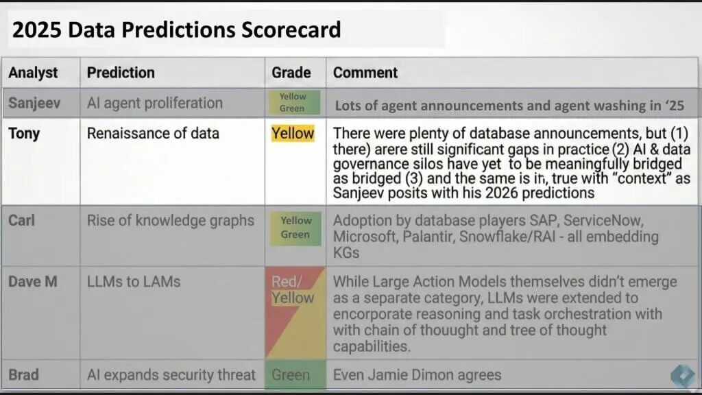 当被追问既然有这些,为什么仍然选择黄色时,Baer说 "世界不仅仅是供应商公告。" 他的期望包括客户"迎接挑战",在这方面他看到了显著差距。他强调数据治理和人工智能治理在很大程度上仍然是孤岛化,太多组织仍在运行"同样的旧做法"。他还点名知识图谱作为一个他预期会看到更多进展的领域;相反,他看到了"很多讨论",但没有达到他预期的采用水平。