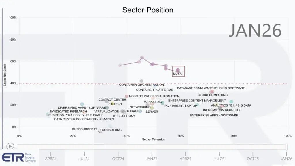 按照惯例,在开始之前,我们想分享一些来自Enterprise Technology Research朋友的调查数据,以强调行业发生了多少变化。ETR每季度对1700多名信息技术决策者进行支出意向调查。我想单独分析机器学习/人工智能领域,向您展示情况的变化。