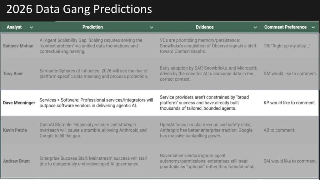 Dave Menninger的2026年预测集中在他相信即将变得更加普遍的市场紧张:代理人工智能需求加速速度快于商业软件工具可以可靠支持,创造了服务提供商——尤其是全球系统集成商——蓬勃发展的空间,而传统软件即服务供应商感到压力。