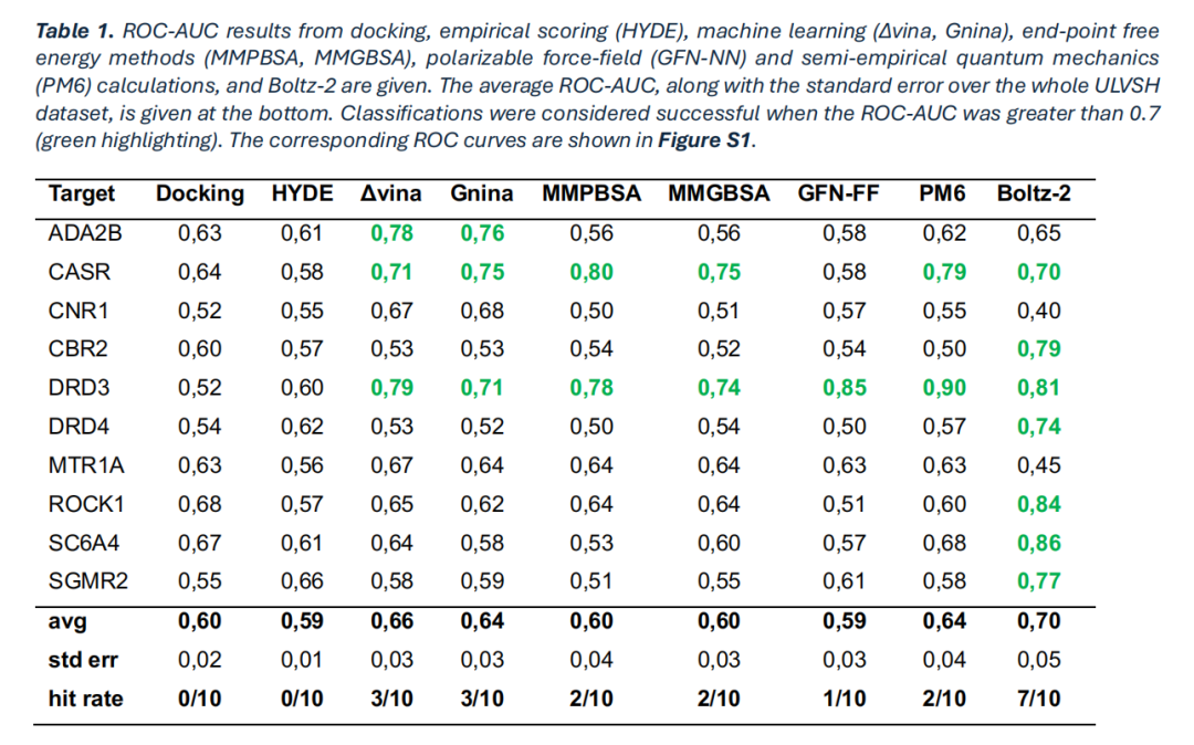 实验设计与方法 研究以ULVSH数据集为测试对象,基于配体的MOL2坐标和蛋白的FASTA序列,构建自动化流程完成Boltz-2的输入文件准备、模型运行与亲和力预测。同时,选取分子对接、经验打分(HYDE)、机器学习(Δvina、Gnina)、端点自由能计算(MMPBSA、MMGBSA)等8类主流重打分方法作为对照,以ROC-AUC值为核心评价指标,对比各方法的分类性能。核心性能突破 精度领先 :Boltz-2的平均ROC-AUC值达到0.70,显著高于所有对照方法。当以ROC-AUC>0.7作为“成功分类”的标准时,Boltz-2的成功率为7/10,是第二名方法的两倍以上。效率优势显著 :在单张最新GPU卡(RTX 4500 Ada Generation)上,Boltz-2预测单个配体的结合亲和力需约100秒,全数据集处理时间不超过1天。该速度较传统物理模拟方法提升了三个数量级,且在不同GPU硬件(RTX A4500)上表现出良好的稳定性,靶标间ROC-AUC偏差绝对值低于0.04。普适性强 :无需依赖蛋白的三维晶体结构,可直接应用于未被结构解析的靶点,极大拓展了虚拟筛选的适用范围。局限性分析 值得注意的是,Boltz-2在CNR1和MTR1A两个靶点上的预测性能不佳,ROC-AUC值分别仅为0.40和0.45。研究团队通过优化模型参数、引入实验结构模板、缩减蛋白序列域等多种策略进行改进,但均未显著提升这两个靶点的预测精度。排除这两个靶点后,Boltz-2的平均ROC-AUC值可提升至0.77,进一步印证了其在多数靶点上的优异性能。三、AI驱动虚拟筛选的行业价值与未来方向 Boltz-2的出现,不仅是技术层面的突破,更标志着药物发现领域正迎来从传统方法向AI驱动的范式转移 。