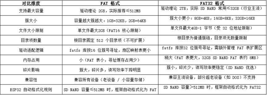3. 实际应用中,跟随esp-idf自动格式化规则即可:小容量≤512MB 为 FAT,大容量>512MB 为 FAT32,SD NAND 主流 32GB 容量优选 FAT32;