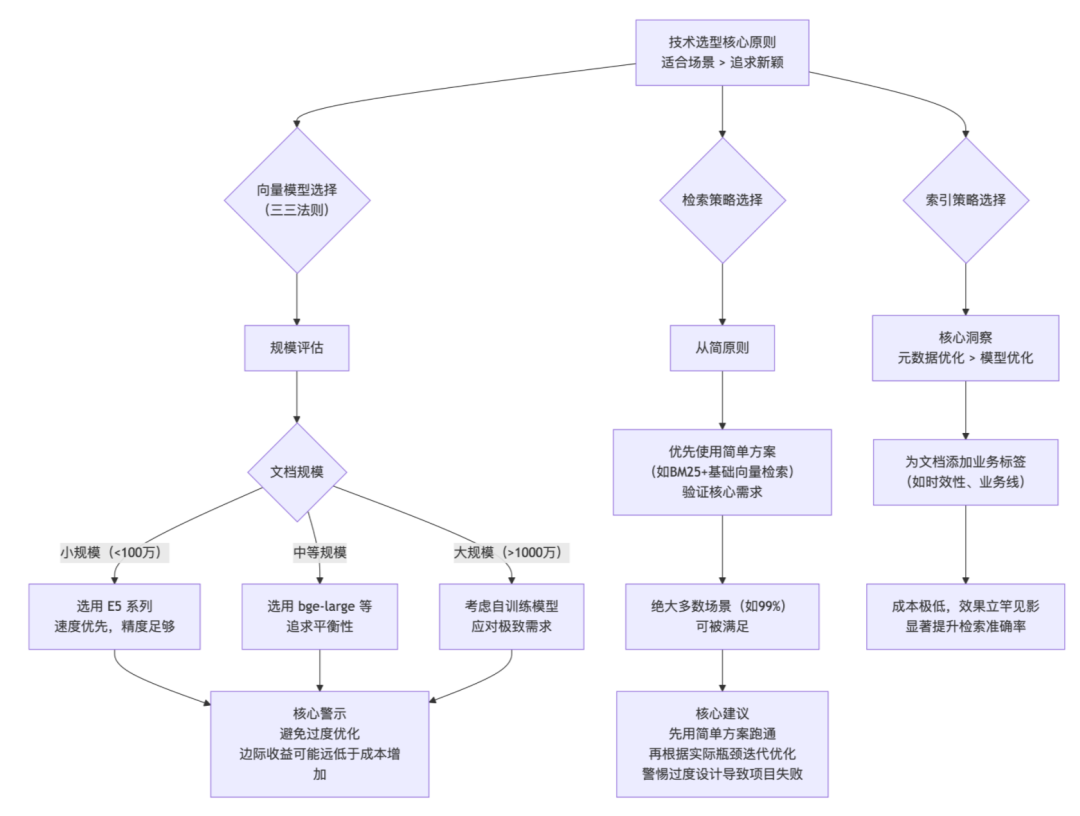 我总结了个"三三法则":小规模(<100万文档)用E5,速度快精度够;中等规模用bge-large,平衡性好;大规模(>1000万)才考虑自训模型。