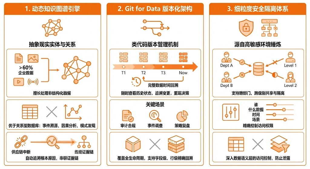 传统数据库存放的是庞杂的原始信息,大模型难以直接理解和处理;本体论能够把这些信息重组为语义化、结构化的知识网络,通过时间、关系、事件等维度压缩与语境化,为大模型提供高质量的上下文输入,避免被海量噪声淹没。