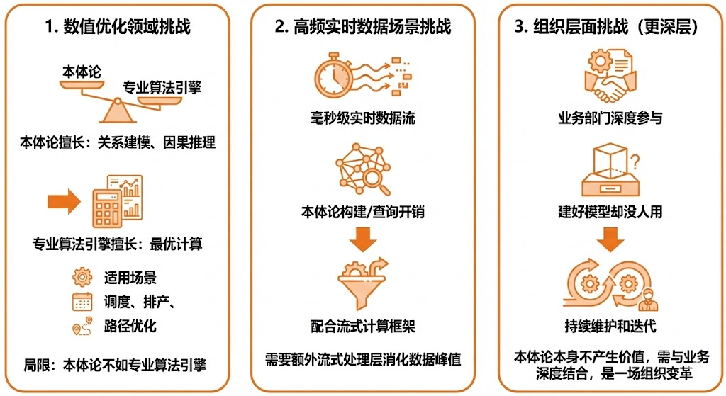 调度、排产、路径优化等场景需要借助线性规划、约束求解等专业算法,本体论擅长的是关系建模和因果推理,而非最优计算。