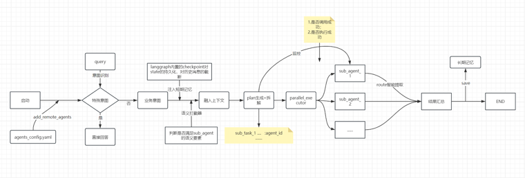 用户问题进来时会对问题做多级分流:简单意图和业务意图;业务意图中对于需要sub_agent协同的方式中做任务规划,分为串行/并行的简单业务任务以及混合执行的复杂业务任务。