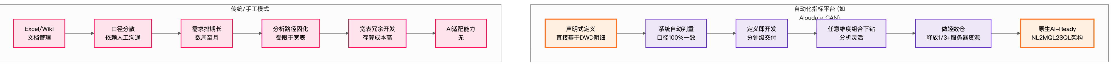 核心区别在于 对底层数据的依赖和计算模式。Headless BI 提供了一个统一的语义层,但其计算仍 依赖 于下游数仓预先构建好的物理宽表或汇总表(ADS 层)。而自动化指标平台基于 NoETL 语义编织技术,能 直接 基于 DWD 明细数据,通过声明式定义自动生成最优查询,无需预先开发物理宽表。前者是“查询路由层”,后者是“动态计算引擎”。
