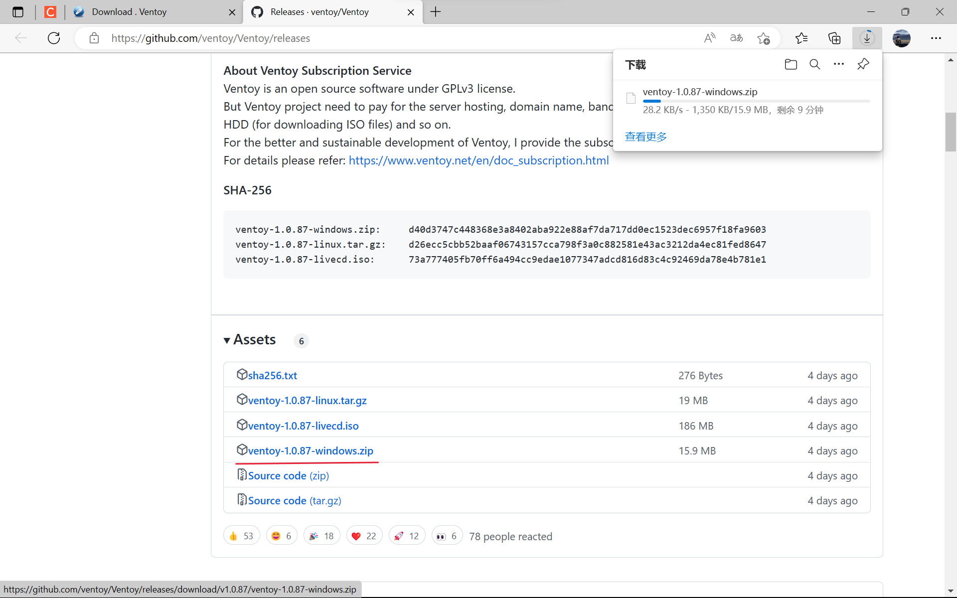 跳转到github界面,此时看到Assets下的zip包,点击即可下载