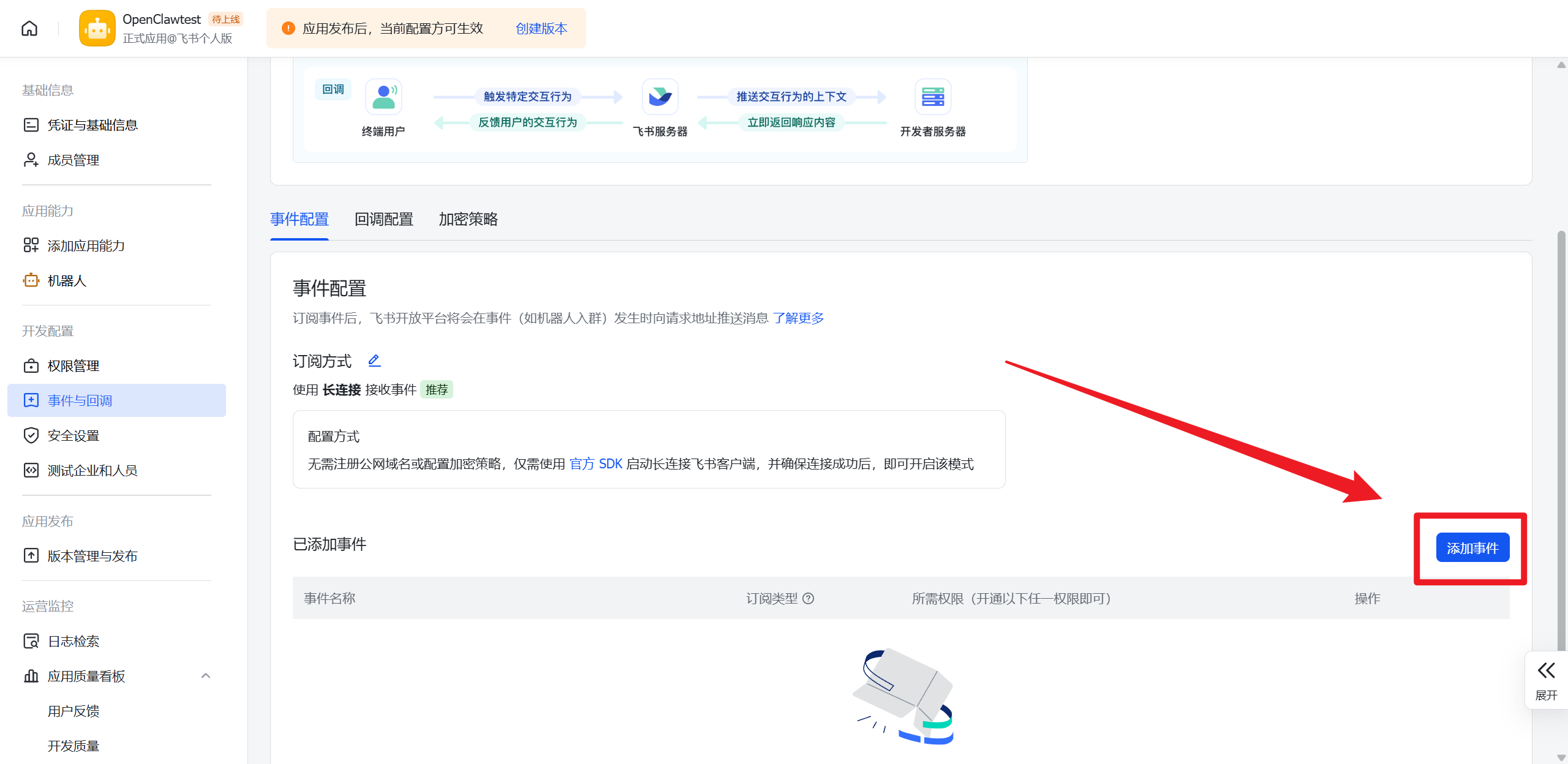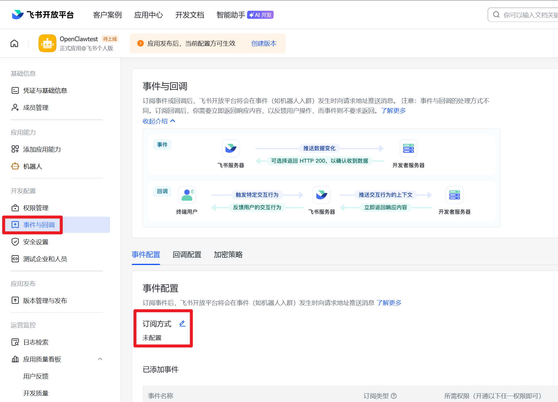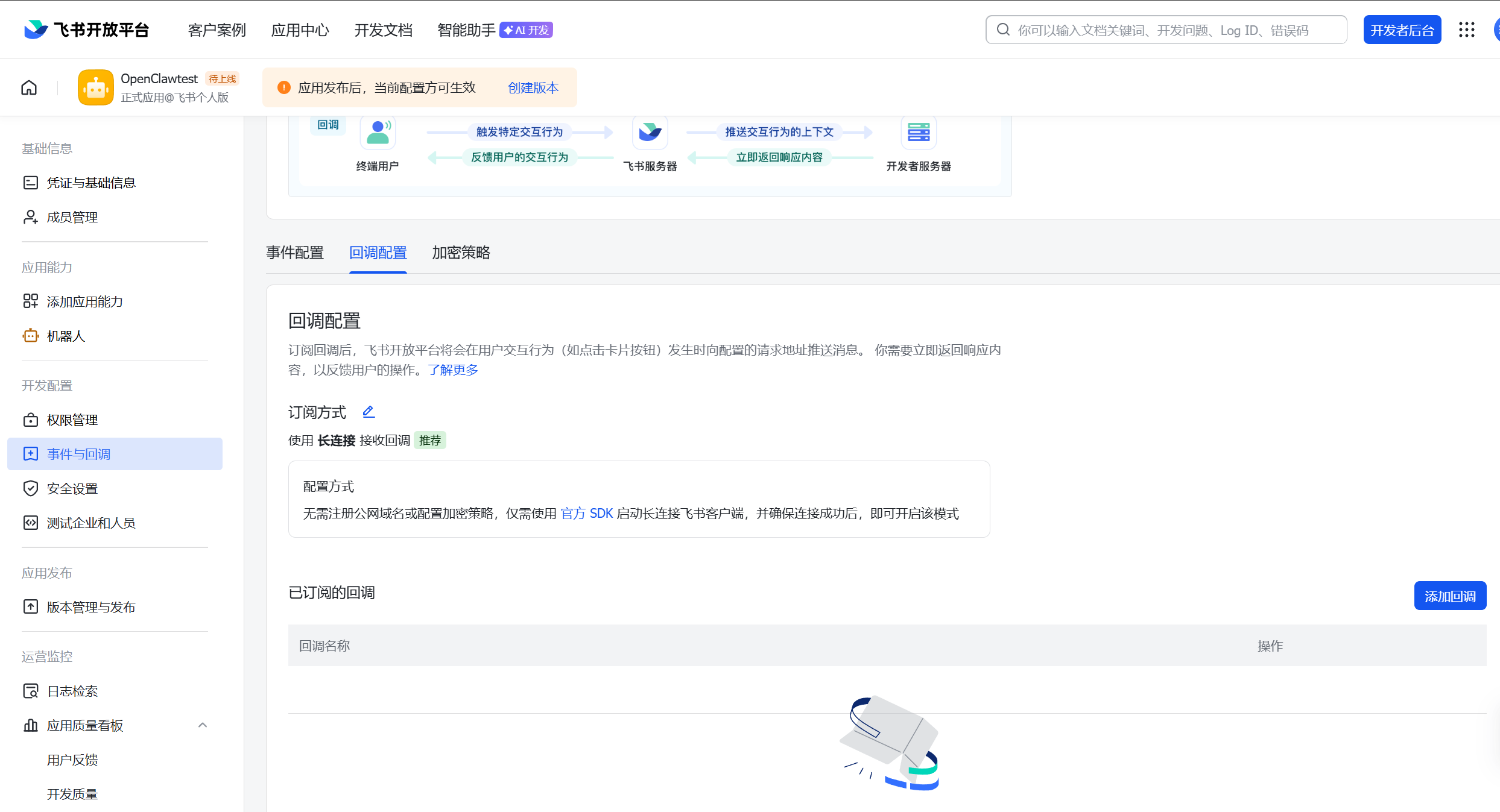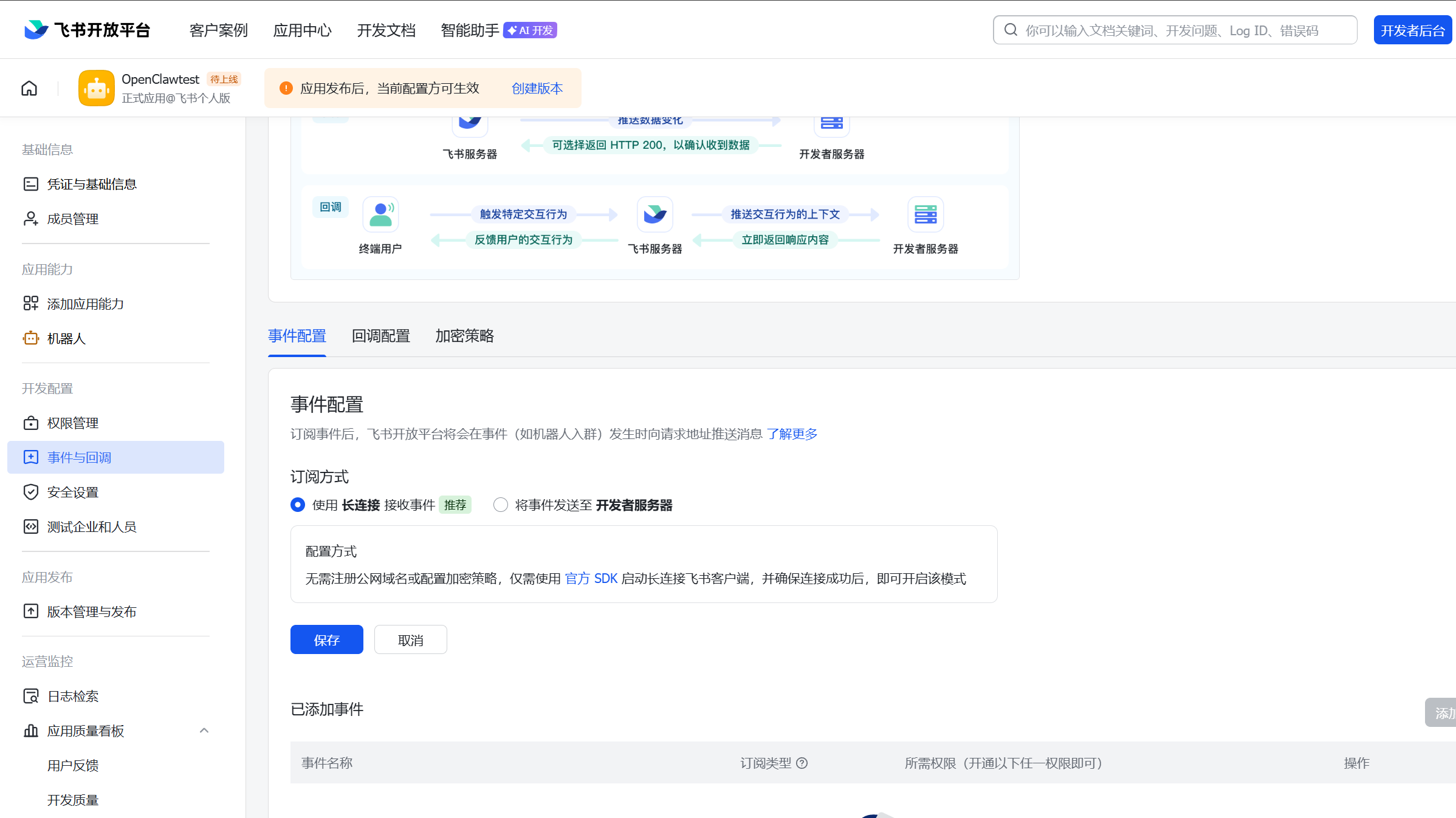 在【事件与回调】中编辑【订阅方式】,选择【长链接】