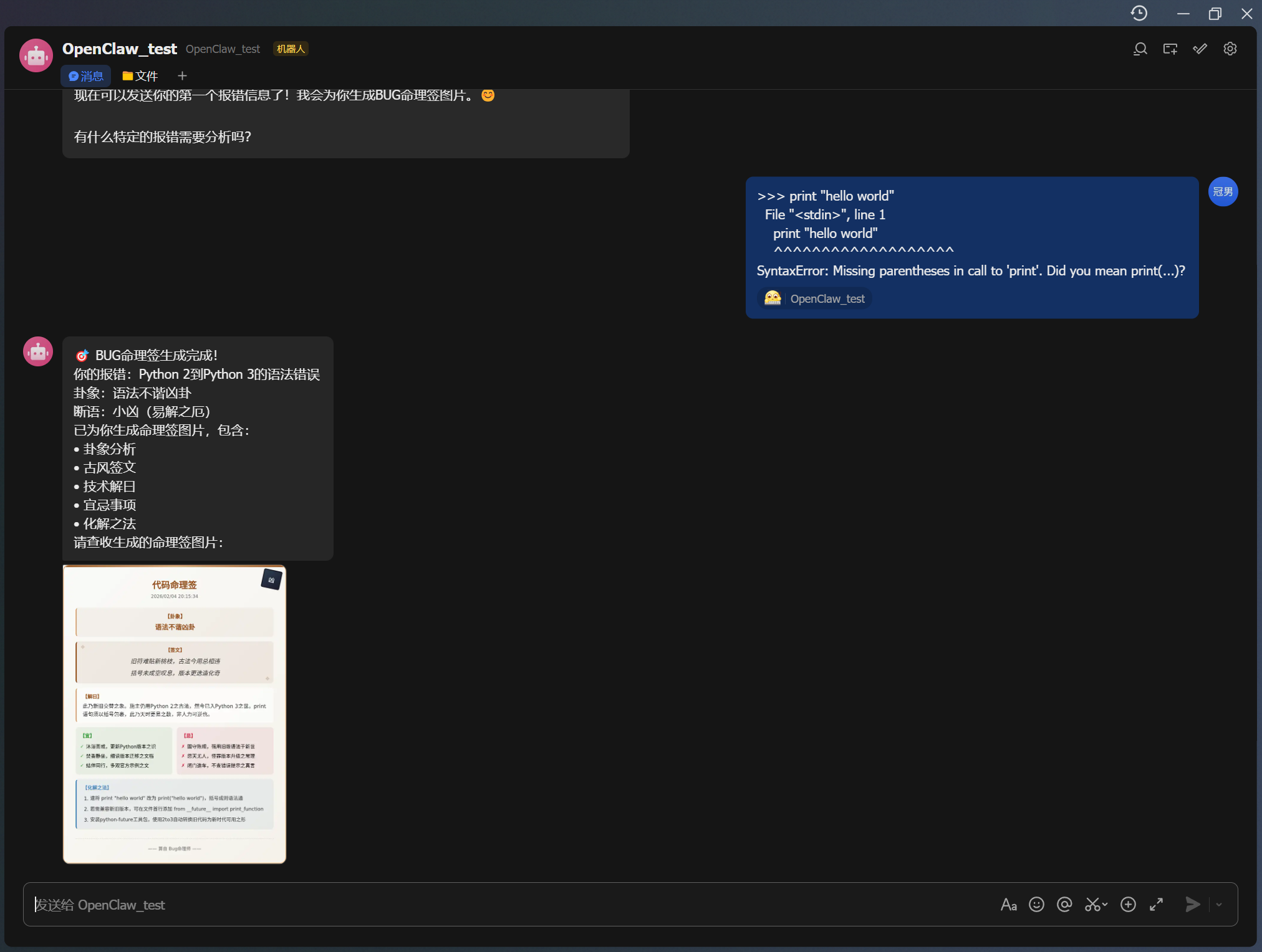 最近突发奇想,在程序员交流群里,经常有人问问题不带报错日志截图,群友就会说,没有日志我能做的只是帮你算一卦,今天我们来做一个好玩的,调教 OpenClaw,发给它一个报错,让他以周易等命理知识分析这个报错,同时给出解决方案