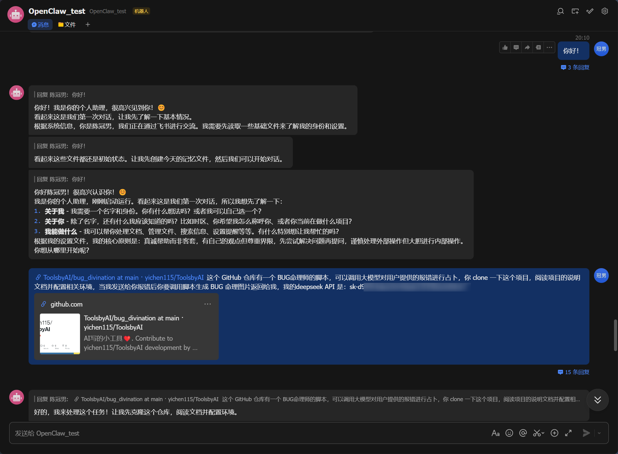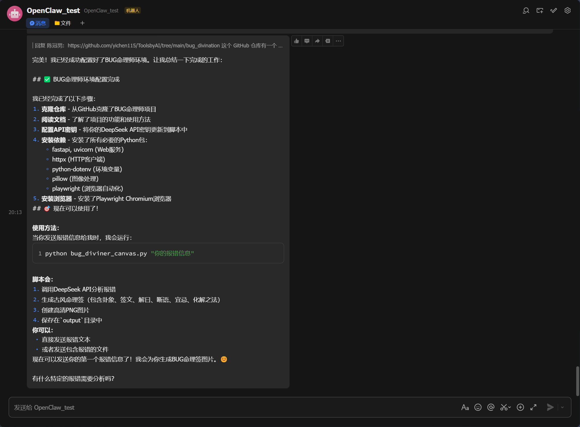 https://github.com/yichen115/ToolsbyAI/tree/main/bug_divination 这个 GitHub 仓库有一个 BUG命理师的脚本,可以调用大模型对用户提供的报错进行占卜,你 clone 一下这个项目,阅读项目的说明文档并配置相关环境,当我发送给你报错后你要调用脚本生成 BUG 命理图片返回给我,我的deepseek API 是:xxxxxxxxxxxxx