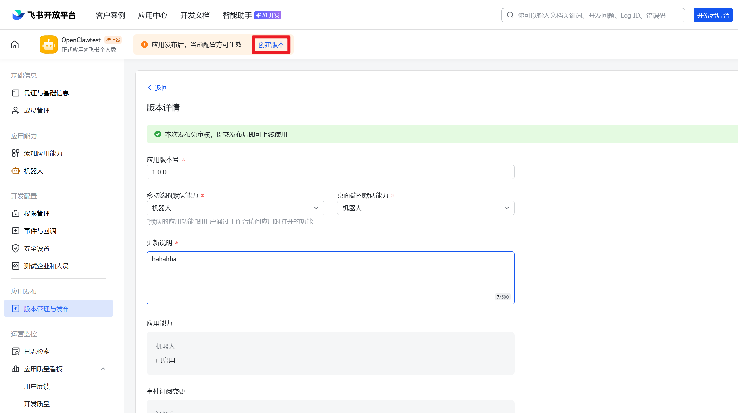}最后【创建版本】发布,版本号等信息随意填写,拖到最下面点击保存并确认发布