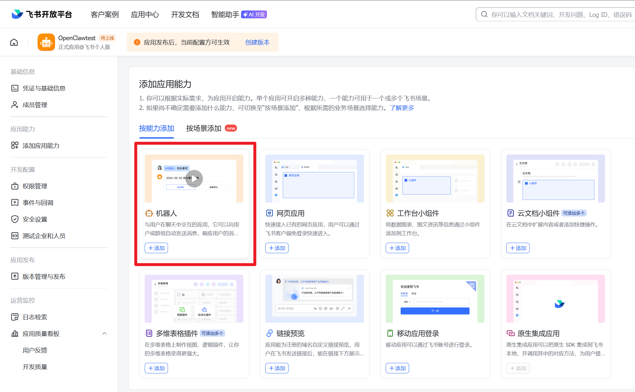 在【凭证与基础信息】中找到应用凭证,将机器人的【App ID】以及【App Secret】复制到OpenClaw 应用管理界面的 Channel 中并【应用】