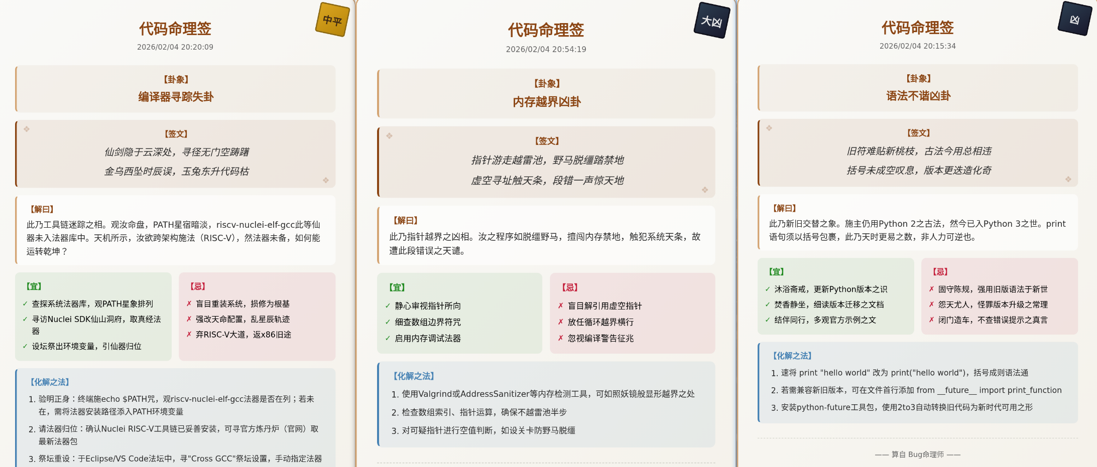 突然想到一个点子,在程序员群里,经常有人问问题不带报错日志截图,群友就会说,没有日志我能做的只是帮你算一卦,我们来做一个好玩的,创建一个 python 脚本,运行一个网页服务,前端有一个输入框,用户输入报错信息后调用大模型API分析报错的命理,然后以固定的模板生成可保存的图片,注意不用真的生成图片,用网页来制作,然后保存为图片即可