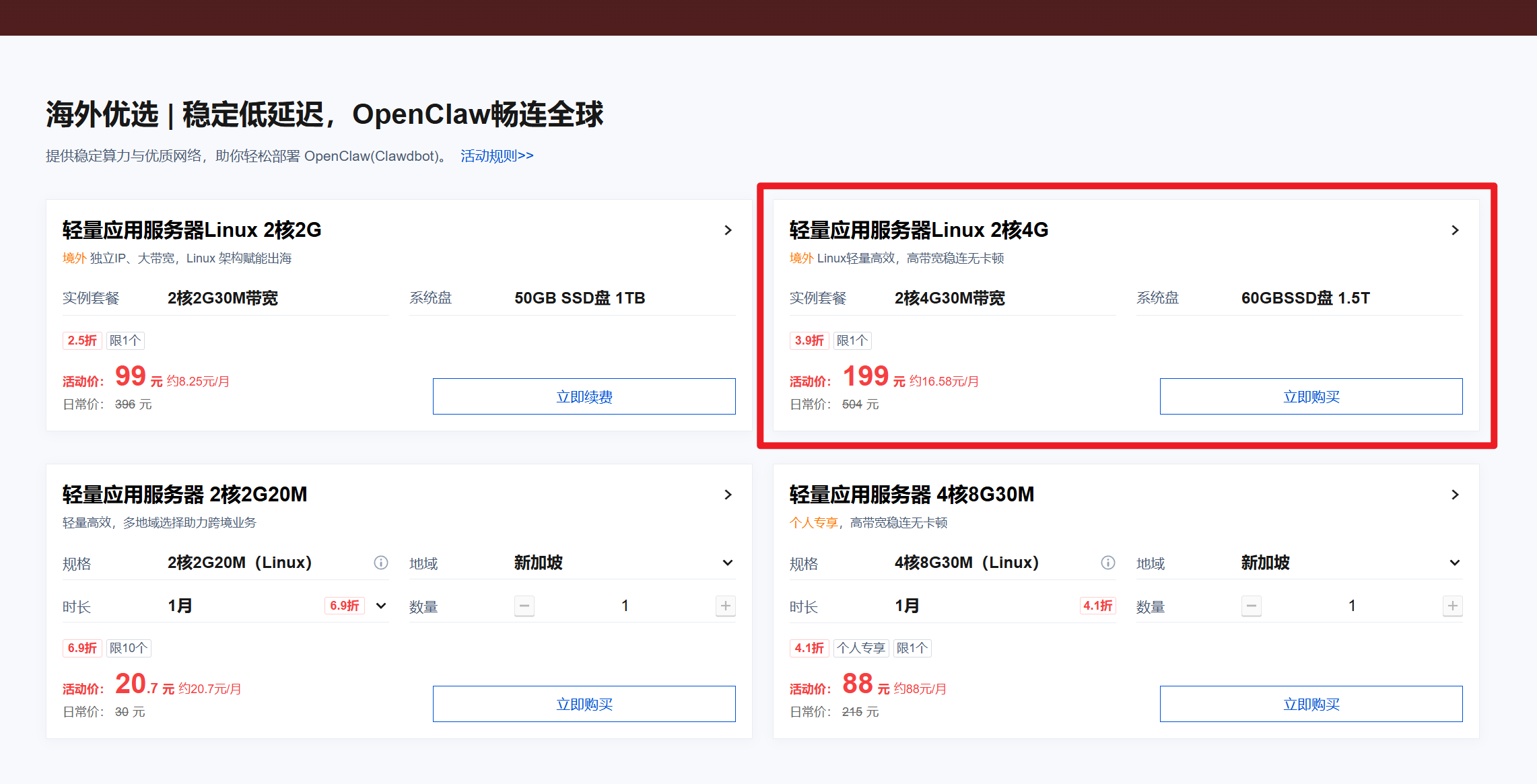 OpenClaw 爆火之后国内云厂商非常给力的推出了一键部署服务,我们以腾讯云为例,进入 OpenClaw 轻量应用服务器专属优惠购买链接:https://cloud.tencent.com/act/pro/lighthouse-moltbot