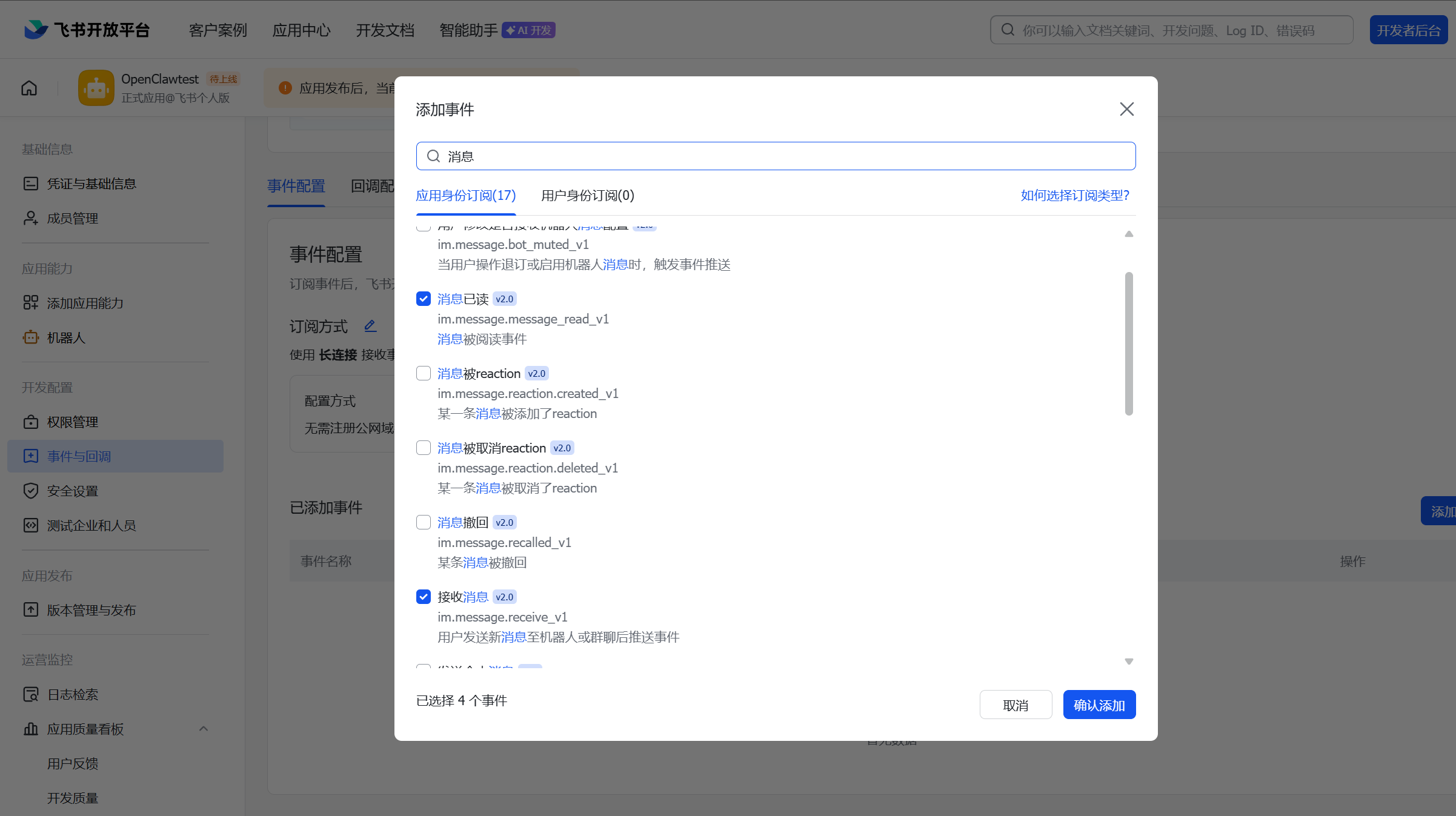 保存后点击【添加事件】在弹出的列表中,勾选【接收消息】、【消息已读】、【机器人进群】、【机器人被移出群】,点击 【确认添加】