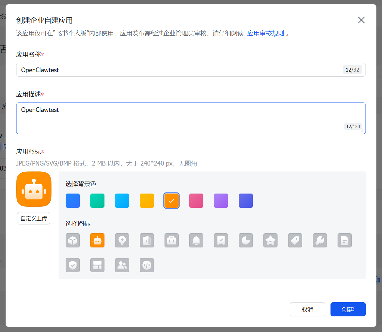 以飞书机器人为例,登录飞书开放平台:https://open.feishu.cn/app?lang=zh-CN,选择【创建企业自建应用】