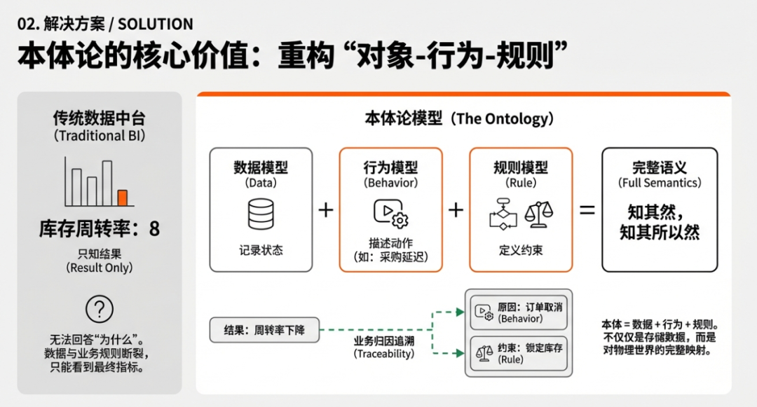行为规则来源于哪里?来源于你的业务场景、业务活动,或者是来源于你对原始历史已有的IT系统的源代码的理解。我把这些东西抽象出来,变成一种类似于伪代码语义,或者是一种Markdown格式的定义都可以。这样我才能够构建一个完完整整的这么一个本体,这样才能够真正的解决"知其然又知其所以然"的问题。这个才是为什么要用本体论的一个关键。