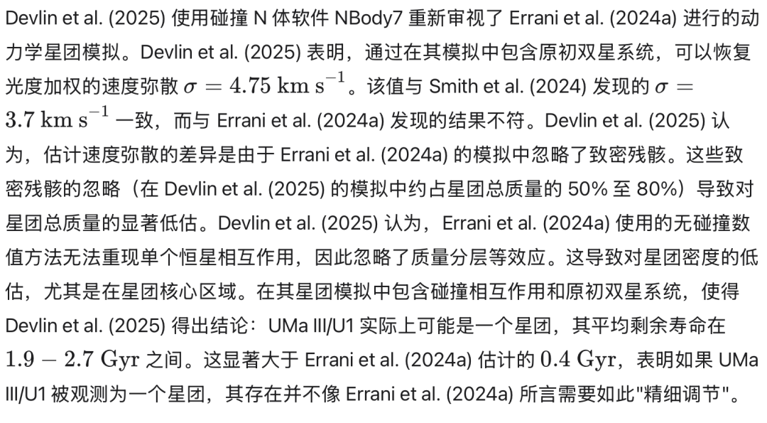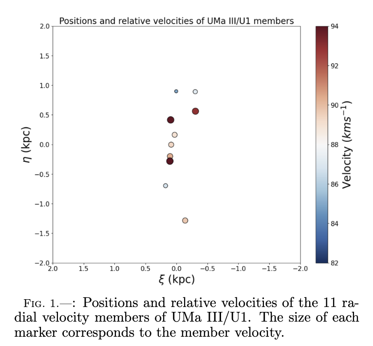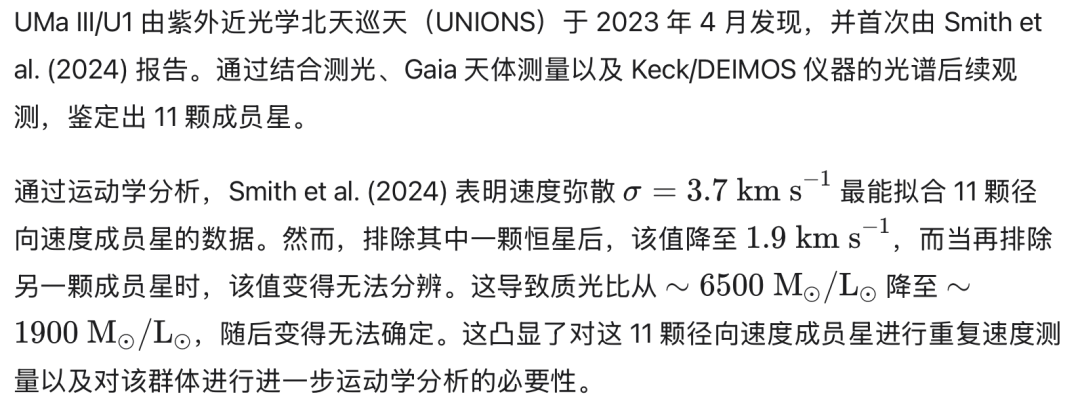 Rostami-Shirazi et al. (2025) 对 UMa III/U1 进行的额外 N 体模拟表明,一个缺乏暗物质的前身天体最能准确地重现 UMa III/U1 当前的性质,这进一步支持了 UMa III/U1 是一个自引力星团的观点。Cerny et al. (2025) 的后续光谱分析倾向于较小的速度和金属丰度弥散,并对这两个值设定了上限。这些值并未提供支持暗物质的观测证据,反而倾向于星团群体的解释——尽管在获得高分辨率丰度模式和更严格的多历元运动学数据之前,UFD 情景仍然可行。