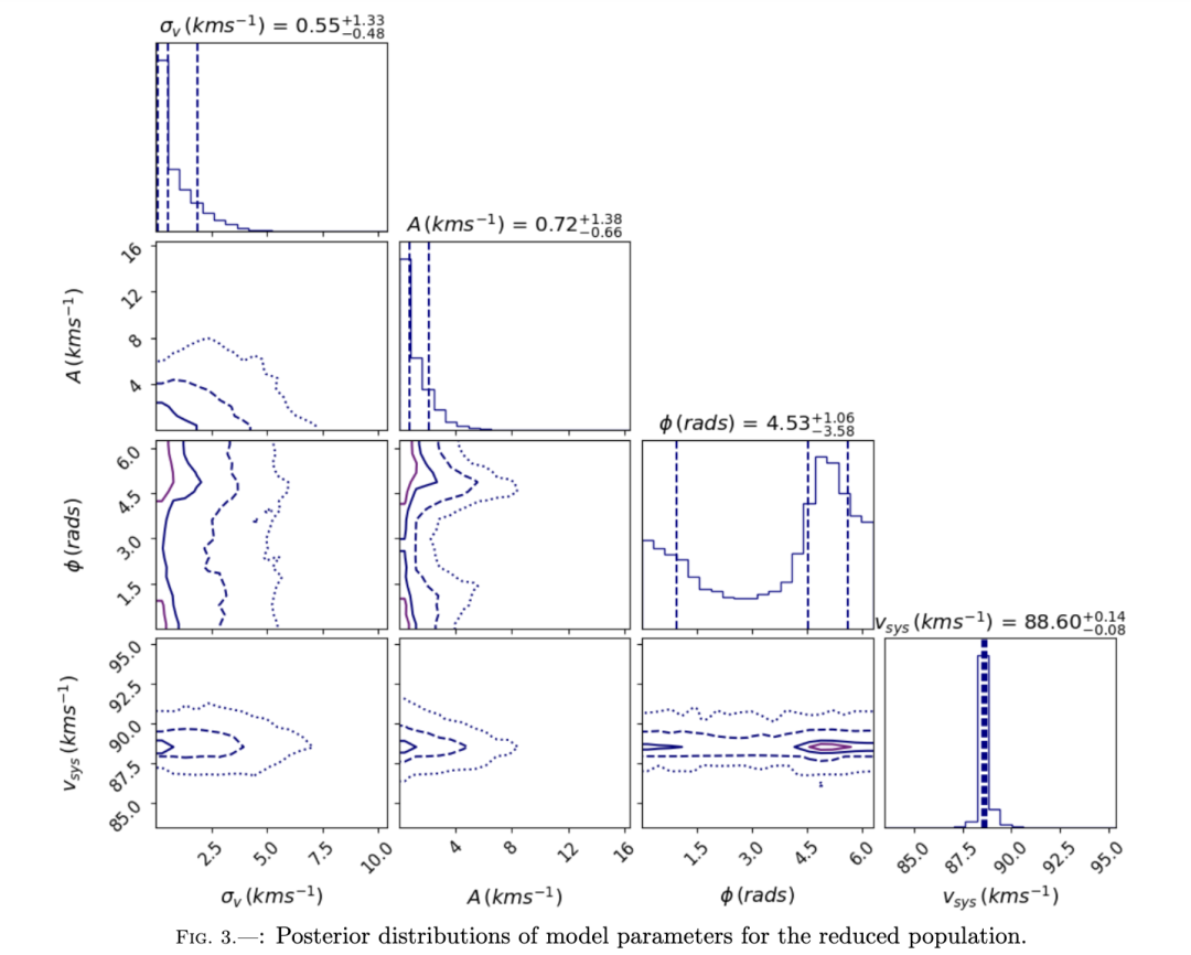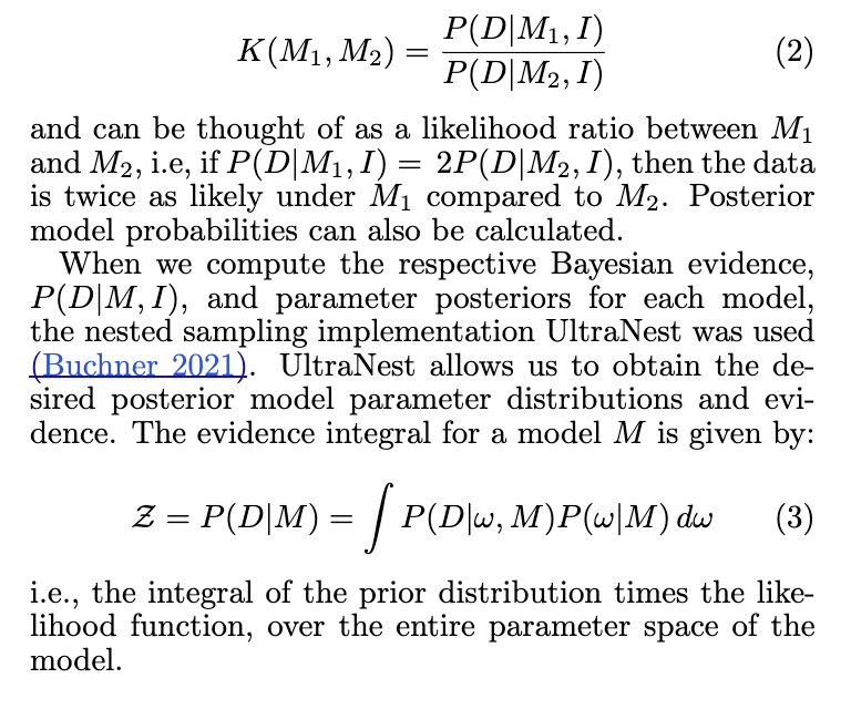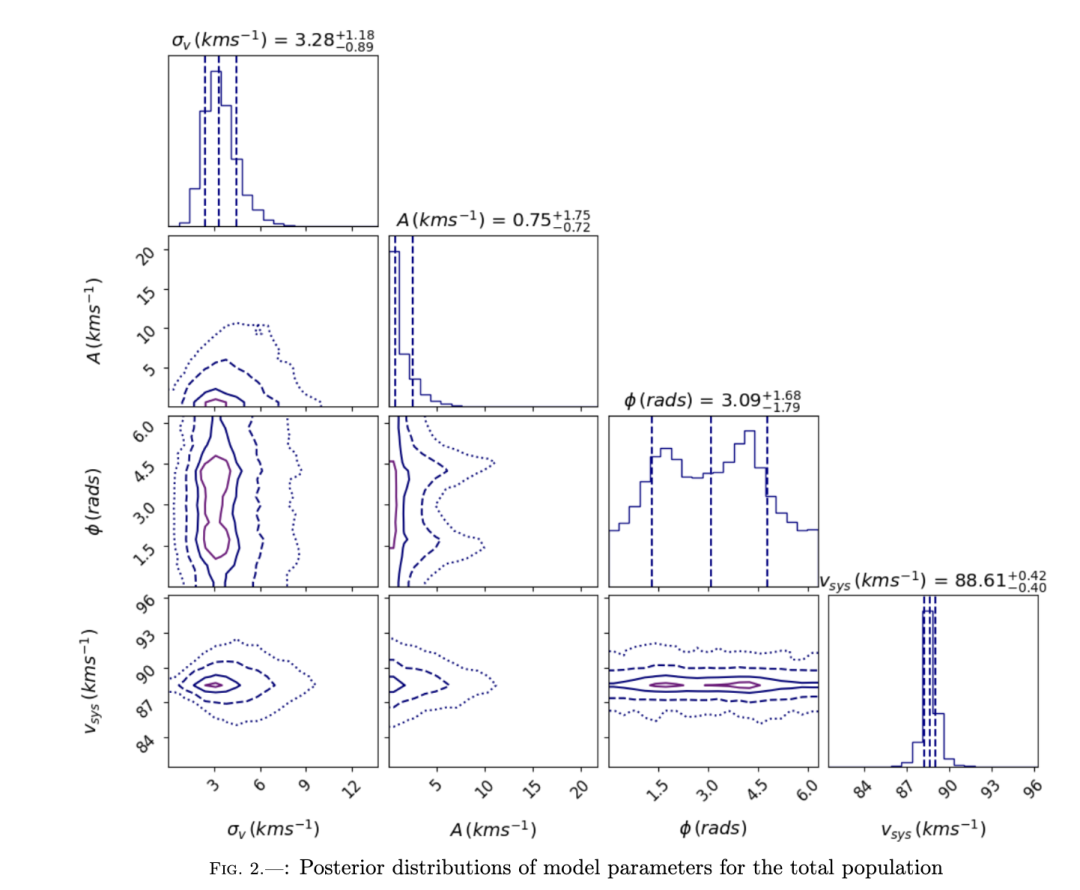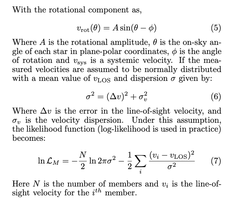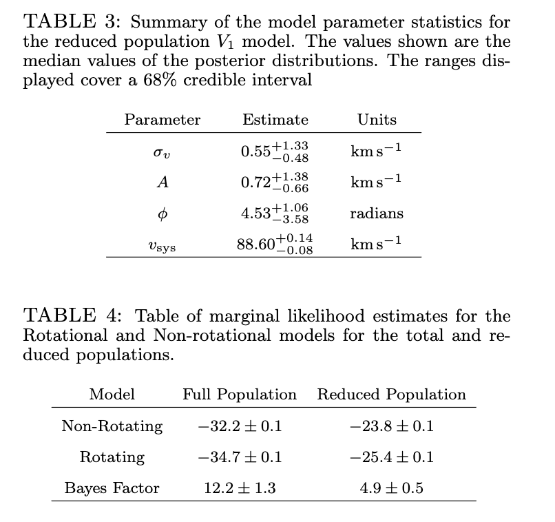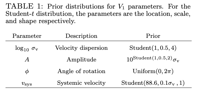 为了探测 UMa III/U1 中可能存在的旋转,我们将使用贝叶斯推断来确定属于旋转模型(见表 1)的参数的后验分布。研究这些后验分布将使我们能够量化 UMa III/U1 正在旋转的概率,并据此估计 UMa III/U1 的总质量。这些后验分布由贝叶斯定理给出: