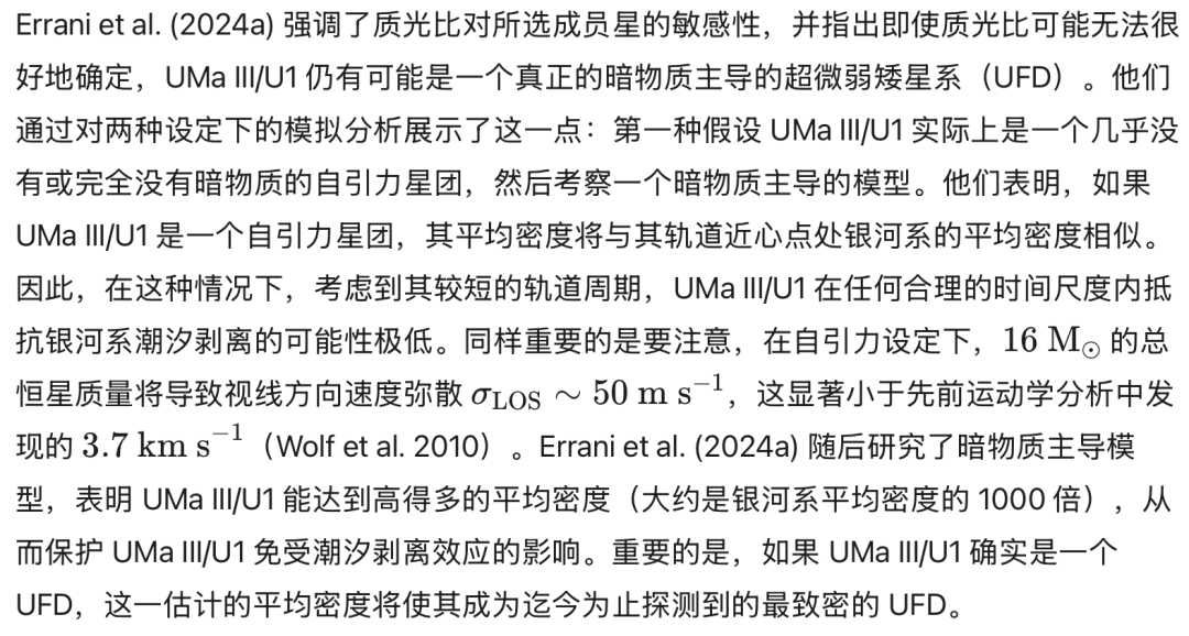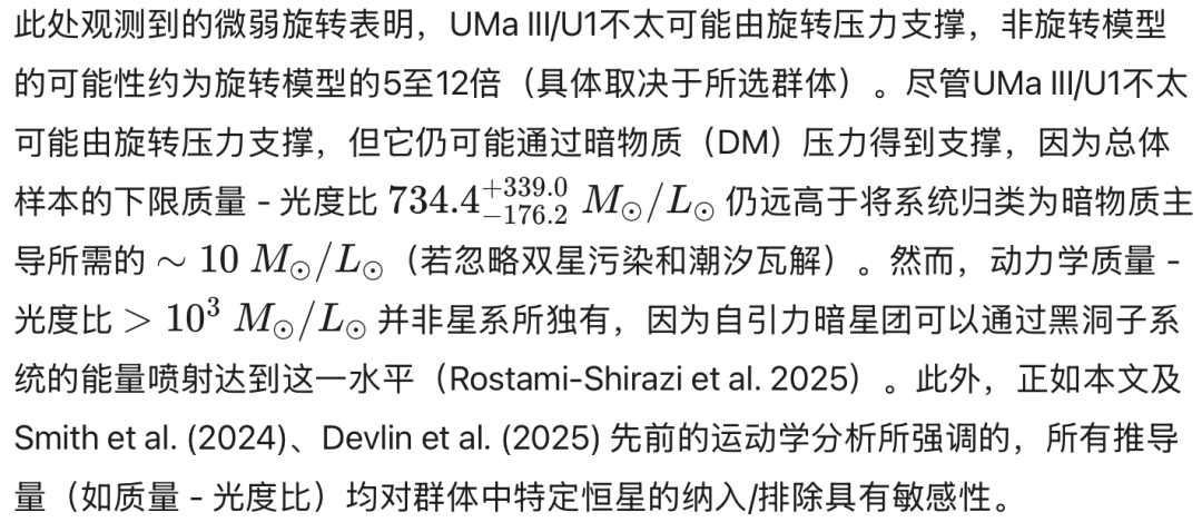 。我们要得出结论,UMa III/U1仍然是一个性质模棱两可的天体,对于UFD和自引力星团这两种假设都有成立的论据,然而在这两种假设下,UMa III/U1都不太可能由旋转压力提供支撑。