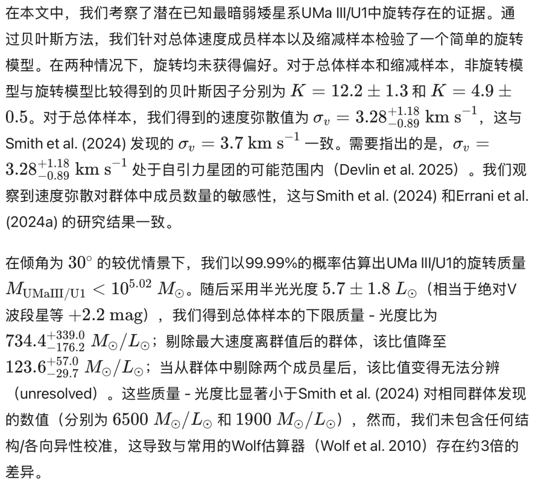 因此,UMa III/U1仍然是一个模糊不清的天体,超微弱矮星系(UFD)和自引力星团两种情景目前均仍具可行性。我们得出结论:无论UMa III/U1最终被证实属于哪种情景,它由旋转支撑的可能性都非常低。为帮助减少未来研究中的这种模糊性,需要对UMa III/U1进行持续的速度测量。
