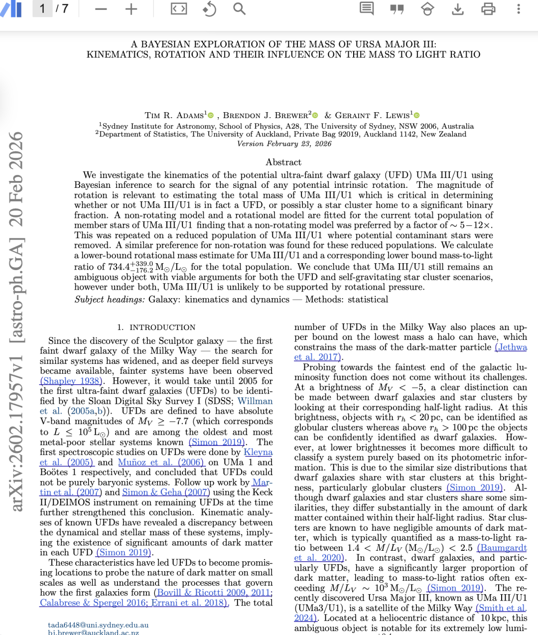 本文结构如下:首先,在第 2 节中,我们总结了关于 UMa III/U1 的现有文献。在第 3 节中,我们概述了我们的方法,在 3.1 小节详细介绍了数据,在 3.2 节介绍了我们的贝叶斯方法,在 3.3 节介绍了我们的运动学建模。我们在第 4 节展示结果,在第 5 节给出结论。