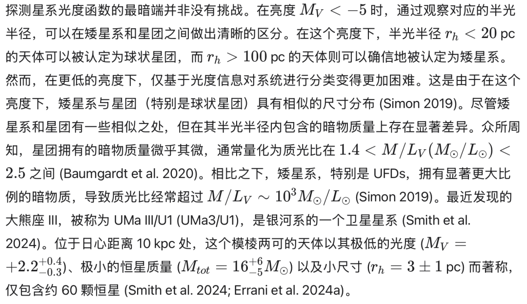 ,它们是已知最古老且金属丰度最低的恒星系统之一 (Simon 2019)。关于 UFDs 的首批光谱研究是由 Kleyna et al. (2005) 和 Muñoz et al. (2006) 分别对 UMa 1 和 Boötes 1 进行的,结论是 UFDs 不可能是纯粹的重子系统。随后,Martin et al. (2007) 和 Simon & Geha (2007) 利用 Keck II/DEIMOS 仪器对当时剩余的 UFDs 进行的后续工作进一步加强了这一结论。对已知 UFDs 的运动学分析揭示了这些系统的动力学质量与恒星质量之间存在差异,暗示每个 UFD 中都存在显著数量的暗物质 (Simon 2019)。