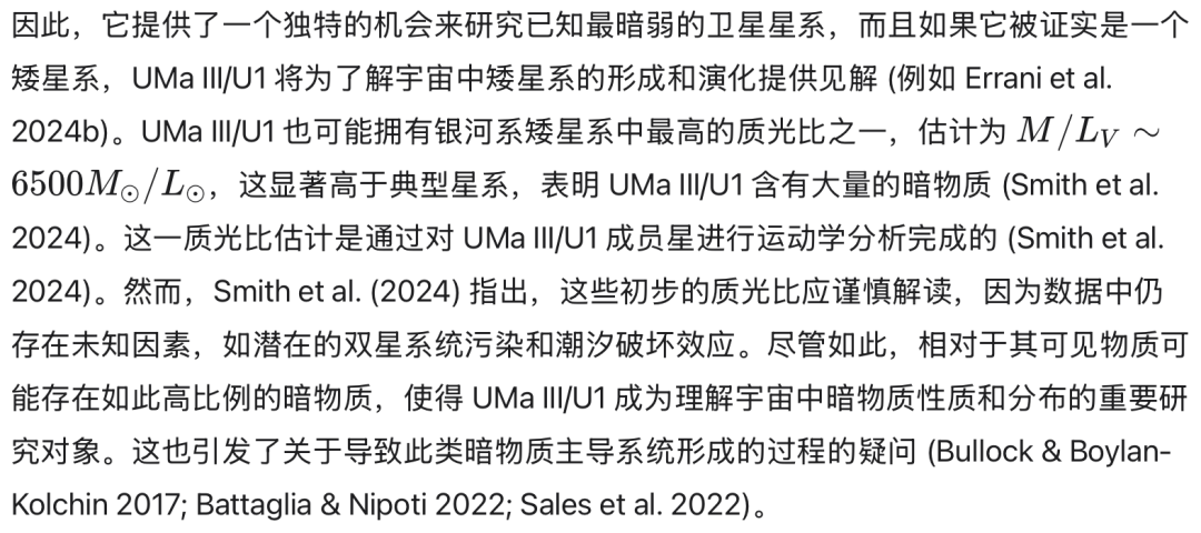 UMa III/U1 潜在的高质光比对宇宙学和星系形成理论具有更广泛的意义。在 Lambda 冷暗物质(ΛCDM)范式下,预言存在大量低质量暗物质晕,它们可能容纳像 UMa III/U1 这样的暗弱星系(Klypin et al. 1999; Bovill & Ricotti 2009; Bullock & Boylan-Kolchin 2017; Simon 2019)。研究 UMa III/U1 可能有助于完善这些形成模型,并增进我们对星系形成所需最小晕质量的理解。它也为替代性暗物质理论提供了一个有价值的测试案例,这可能为暗物质本身的基本性质提供新的见解(Zhang et al. 2024; Errani et al. 2024b)。此外,UMa III/U1 可能是一个矮椭球星系(dSph),这使其成为研究暗物质湮灭的一个有吸引力的候选体。尽管 UMa III/U1 处于 dSph 质量的低端,但其较近的距离和潜在的高质光比导致其 J 因子约为