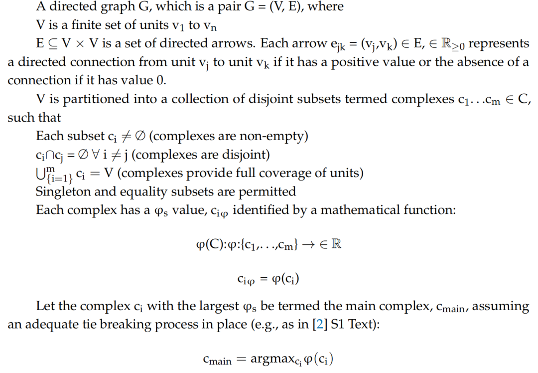 从分析角度来看,复合体可以被理解为微单元的集合。具体而言,复合体是具有特定数学性质的微单元集合:在所有至少共享一个单元的候选单元集中,它具有最大不可约性。这些候选单元集是基于所有可能的时空尺度识别的,在这些尺度下,微单元可以聚合成因果作用结构中的单元,并可通过转移概率矩阵(TPM)对系统状态进行建模(系统状态是指某一时刻系统中所有二进制单元的集合)。复合体是非重叠的,每个微单元属于且仅属于一个复合体——其中也包括单一单元复合体的情况,即该单元作为单一单元(例如,它与自身的因果关系)时,其不可约性高于包含它的其他候选复合体。