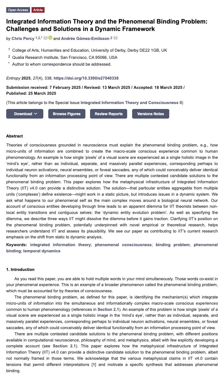 基于神经科学的意识理论必须解释现象学的绑定结合问题,例如微观信息单元是如何组合成人类现象学中常见的宏观意识体验的。一个例子是,视觉场景中的单个“像素”被体验为“心灵之眼”中的单一整体图像,而不是作为个体的、分离的、大规模并行的体验,这些体验可能分别对应于单个神经元激活、神经元集合或中央凹扫视,从信息处理的角度来看,任何一种都可能提供相同的功能。现象学绑定结合问题存在多个有争议的候选解决方案。本文探讨了整合信息理论(IIT)4.0版本的形而上学基础如何提供一种独特的解决方案。这种解决方案——即可以从多个单元聚合而成的特定实体(“复合体”)定义了存在——可能在静态图像中有效,但在动态系统中引入了问题。我们问,当主要复合体在生物神经网络中移动时,我们的现象学自我会发生什么。我们对意识实体随时间发展的描述,导致了 IIT 理论家面临的一个明显困境,即非局域实体转换与连续自我的选择:“动态实体演化问题”。除了明确这一困境外,我们还描述了 IIT 可能在其站稳脚跟之前化解这一困境的三种方式。阐明 IIT 在现象学结合问题上的立场,可能借助新的实证或理论研究作为支撑,有助于研究人员理解 IIT 并评估其合理性。我们认为我们的论文有助于 IIT 当前的研究重点,即从静态分析向动态分析的转变。