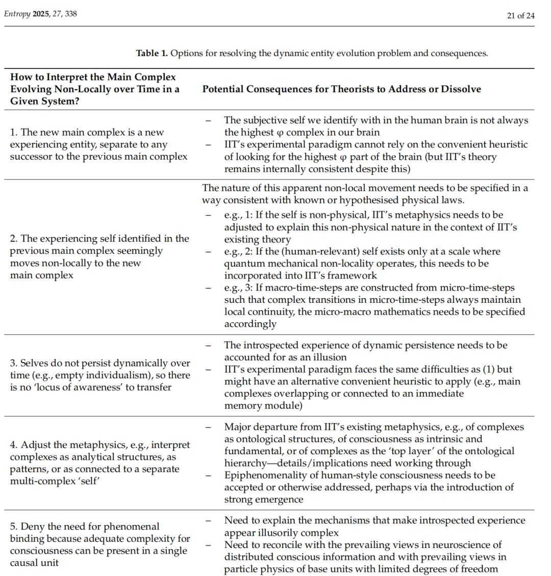 在选项1和2中,还存在避免在时间步之间体验演化中出现超光速信息传递的问题,例如,即使对于局部重叠或局部相邻的主要复合体在时间上的移动也会发生这种情况(第3.3节)。然而,这些问题适用于任何动态分析的IIT,无论对实体连续性和表1中的选项的假设如何。单一时间步中Φ折叠的展开会引发传播问题,每当φ最大化的时空粒度大于基础单元时,包括IIT的人类意识的神经元模型。应该可以开发信息传播动态进入IIT理论以防止这个问题,但目前尚不可用。在这些传播动态中,可能会暂时存在不同的φ值和复合体分布——这些情况也需要探索。解决这个问题是未来研究的有用途径,以帮助IIT从主要静态展示转向动态理论。