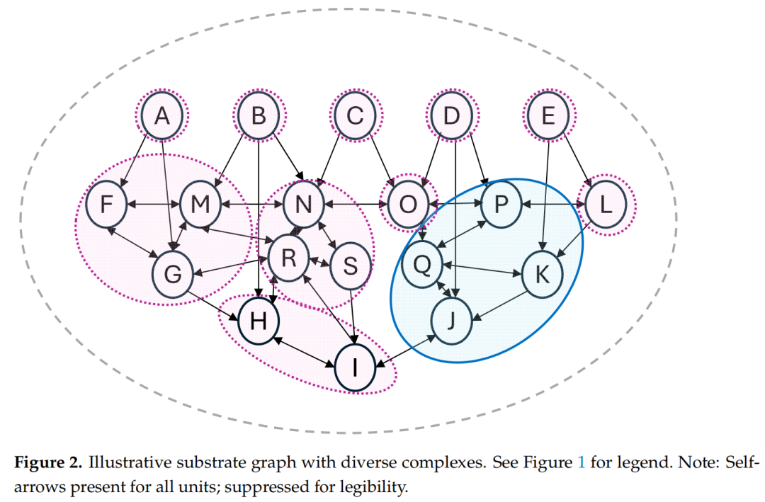 以下讨论不依赖于特定的关系强度或单元状态,因此我们将展示简化为单一线宽(未指定强度;从而支持双向箭头以表示双向因果影响)和简单的圆形单元,其中大写字母标记单元但不指定其状态。我们将使用一个由不同大小复合体混合组成的抽象基底图。从数学上讲,我们只需要: