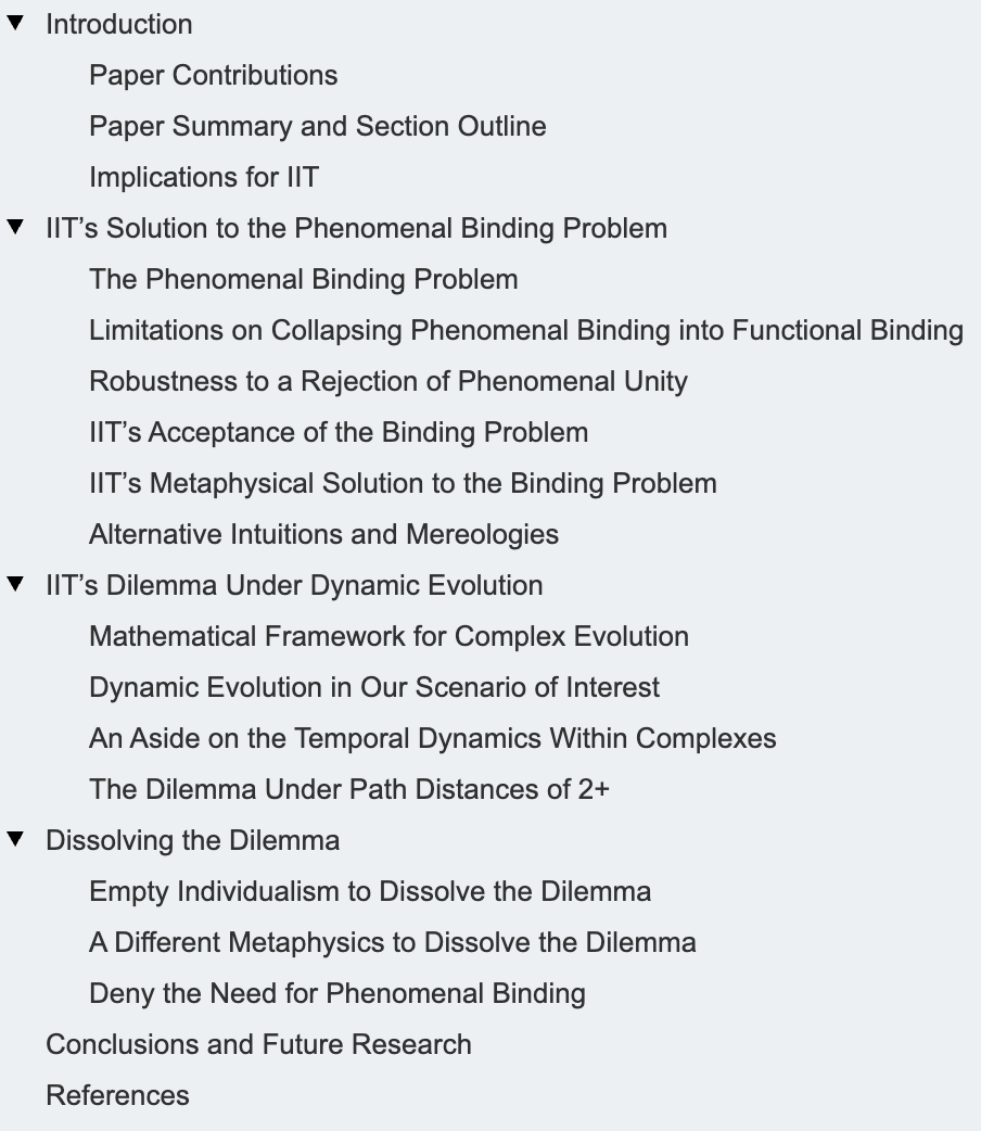 一些IIT理论家可能觉得所提出的选项中有一个是如此明显,以至于可以忽略其他选项。然而,在2024年的会议上,我们的讨论似乎表明,并非所有理论家都必然理解不同选择的后果,或者必然就选择哪个选项达成一致。实际上,IIT的支持者可能会因对现象学结合问题的回应而产生分歧,从而产生不同的理论变体,类似于弱IIT和强IIT之间的分歧。不管怎样,对这一问题的明确立场将为该领域带来有益的清晰度。