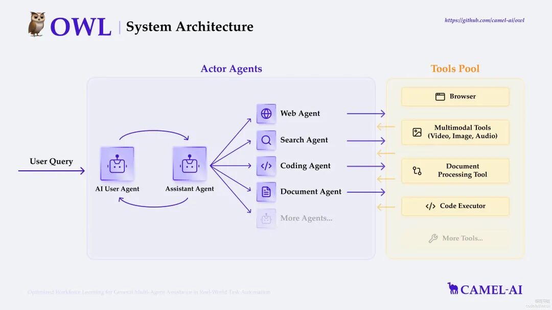 OWL (Optimized Workforce Learning) 是由 CAMEL-AI 团队开源的一款面向 多智能体协作与真实世界任务自动化 的前沿框架。通过 OWL,AI 智能体可以执行终端命令、访问网络资源、运行各种编程语言的代码、使用各种开发工具等等。