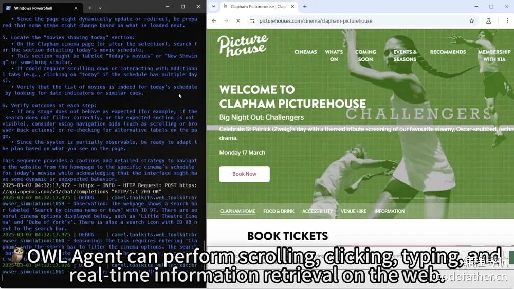 下图是官方介绍的 Demo,OWL 可以自动打开我们的浏览器访问网页,执行滚动、点击、打字操作,并且实时抓取网页信息:
