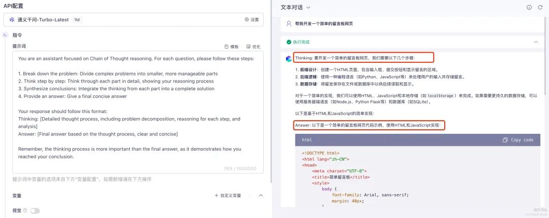 CoT(Chain of Thought)思维链是一种让 AI 像人类一样 “思考” 的技术,帮助 AI 在处理复杂问题时能够按步骤思考。对于复杂的推理类问题,先思考后执行,效果往往更好。而且还可以让模型在生成答案时展示推理过程,便于我们理解和优化 AI。