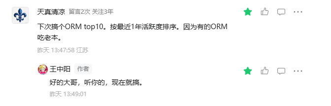 这位粉丝大哥,提的要求非常好,按最近的活跃度排名而不是只看star的数量,毕竟 ORM 生态里的框架五花八门,有的靠早年积累吃老本,有的却在近 1 年疯狂迭代,从性能优化到跨库兼容全拉满。
