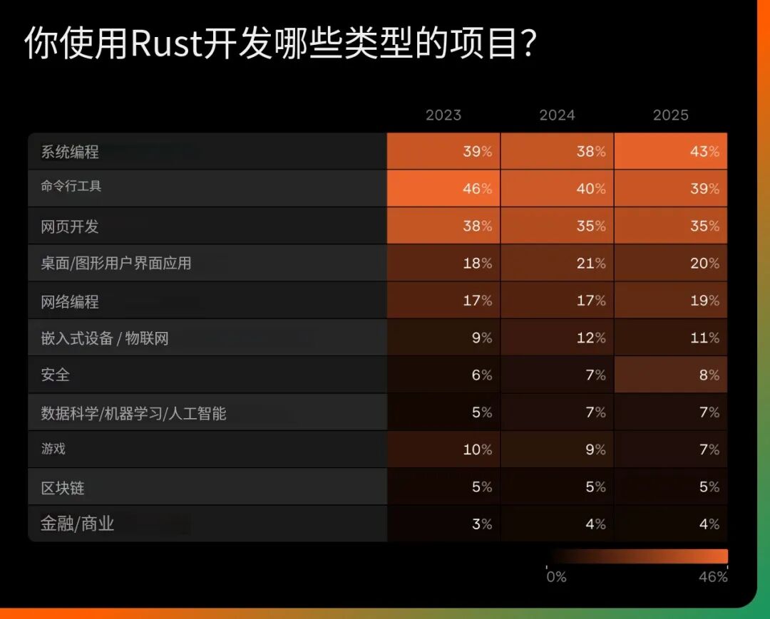系统编程和命令行工具仍然是 Rust 的核心领域。这些领域反映了 Rust 最初设计要解决的问题,并且仍在吸引那些需要性能、控制和安全性的开发者。
