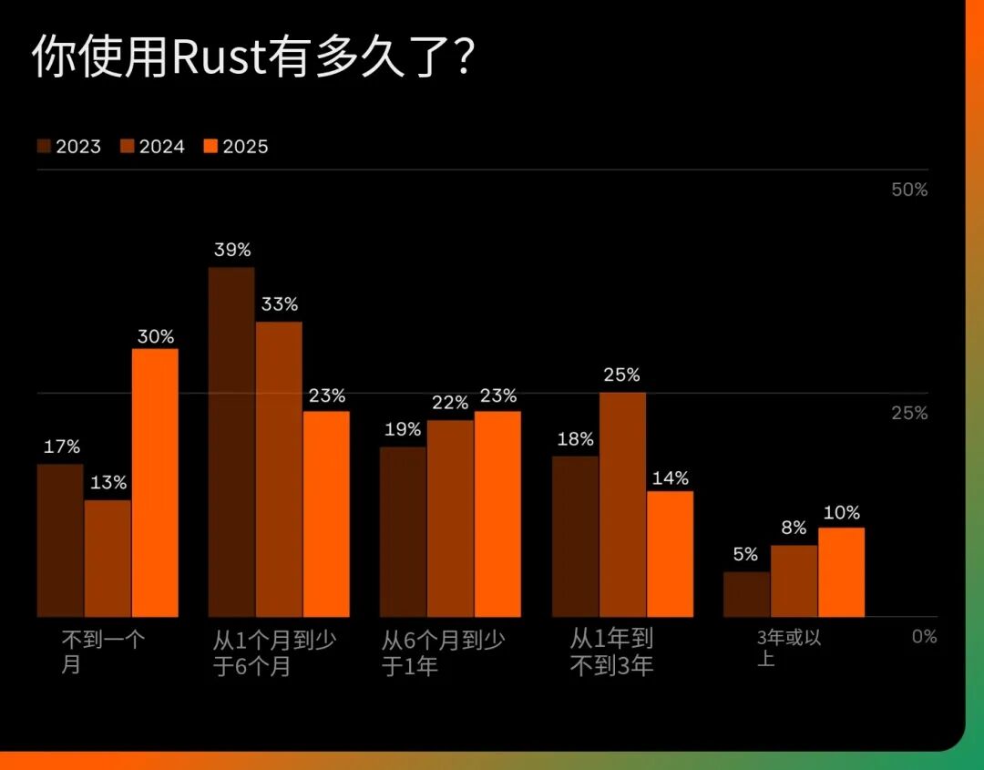 Rust 的发展势头因新用户的稳定涌入而得到加强。2025 年,30% 的受访者报告称,他们开始使用 Rust 还不到一个月。与往年相比,这是一个显著的增长,也是 Rust 热度未减的明确信号。