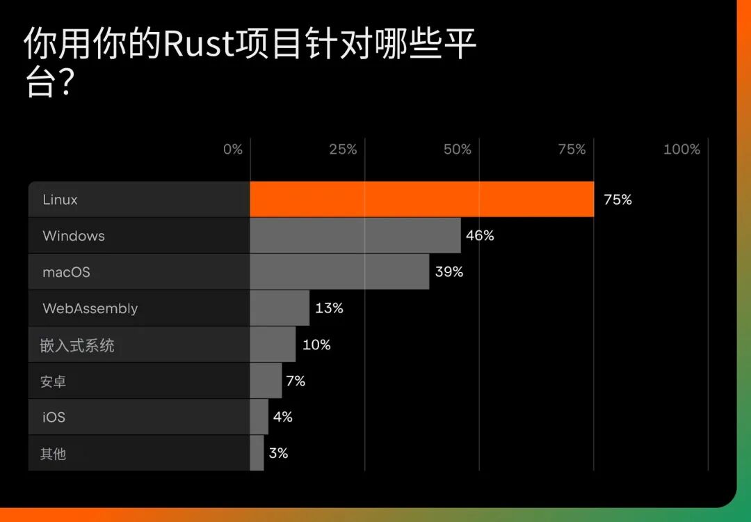 Rust 项目绝大多数都面向生产环境。Linux是目前最主流的平台,有四分之三的受访者在使用,这反映了 Rust 在服务器、云和基础设施工作负载中的强大存在。Windows和 macOS的使用量也相当可观,证实了 Rust 在跨平台开发中的作用。这种对生产和基础设施的关注,与更广泛的行业采用趋势相符。