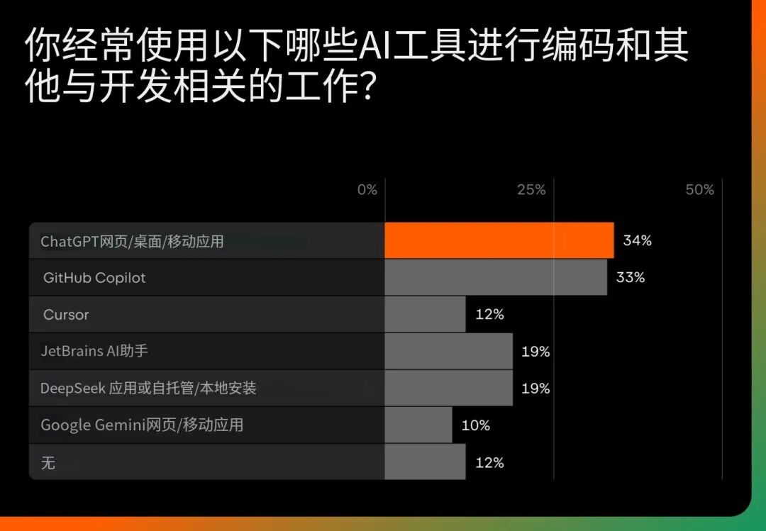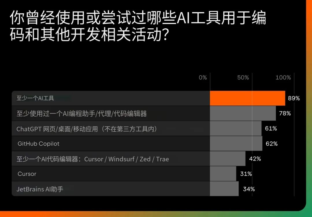 使用模式显示出多样性,而非单一工具主导。开发者将通用的 AI 助手与 IDE 集成解决方案结合使用,根据契合自己工作流程的工具进行选择,而不是只采用一种方法。这种灵活性表明,AI 正在成为开发者工具箱中的又一种工具,而非开发者判断力的替代品。