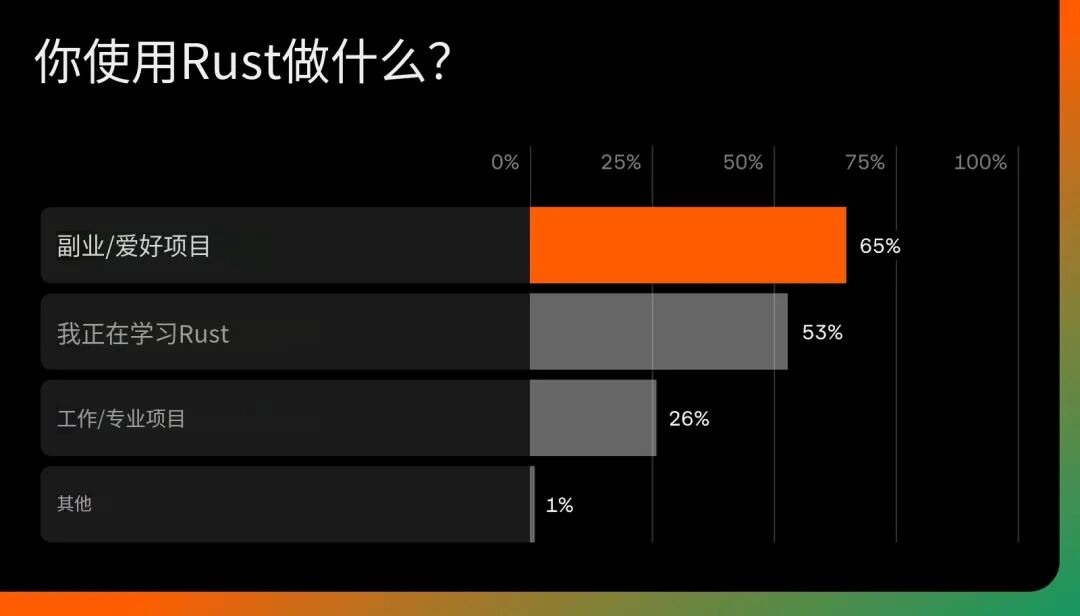 65% 的受访者表示,他们在副业或业余爱好项目中使用 Rust,而 52% 的受访者称自己正在学习这门语言。与此同时,已有 26% 的开发者在专业项目中使用 Rust。这种组合揭示了一个健康的采纳模式:实验性学习与实际应用并存。