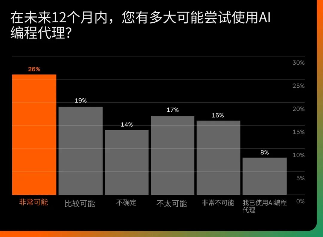 展望未来,对 AI 编码智能体的兴趣虽强,但也带有审慎。约四分之一的受访者表示未来一年内非常可能尝试编码智能体,而其他人则仍不确定或持谨慎态度。这种分化凸显了 Rust 社区的典型特征:好奇心与对控制力、透明度和可靠性的追求并存。